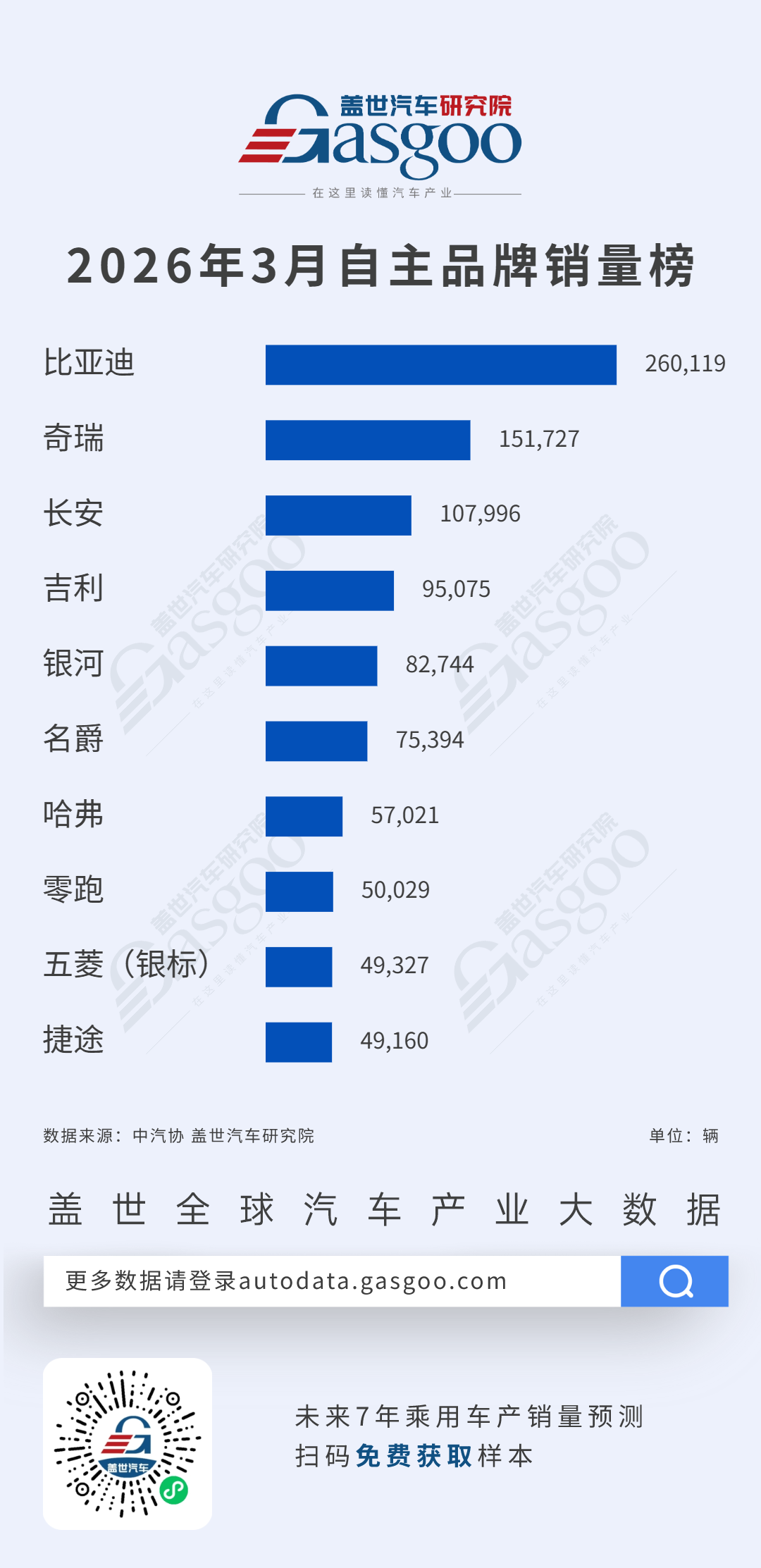 根据盖世汽车研究院数据,2026年3月自主品牌销量榜如下: