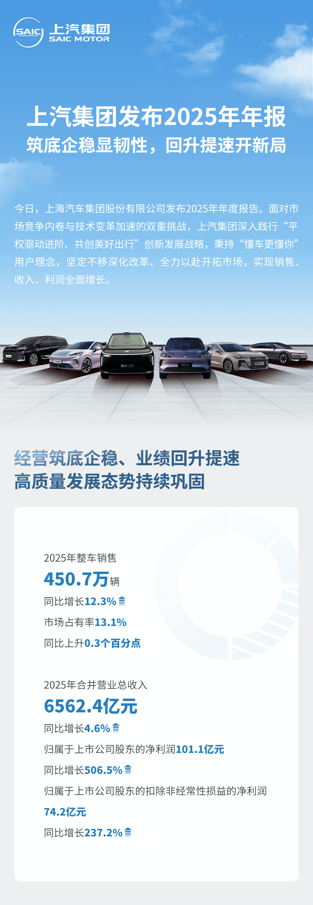 年报显示,2025年上汽集团实现整车销售450.7万辆,同比增长12.3%,市场占有率13.1%,同比上升0.3个百分点;全年实现合并营业总收入6562.4亿元,同比增长4.6%;归属于上市公司股东的净利润101.1亿元,同比增长506.5%,归属于上市公司股东的扣除非经常性损益的净利润74.2亿元,同比增长237.2%,经营筑底企稳、业绩回升提速,高质量发展态势持续巩固。