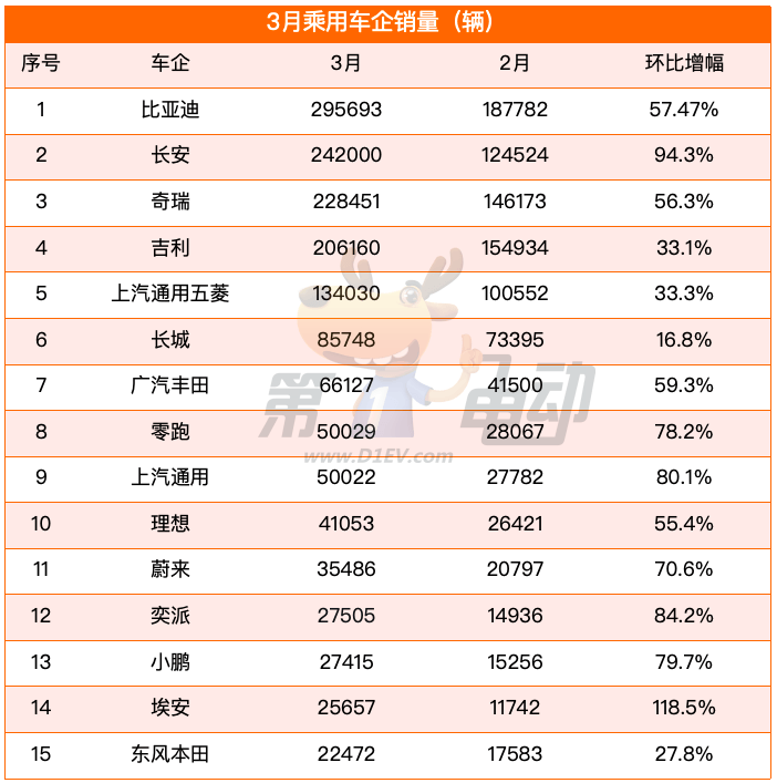 紧随其后的是长安汽车,3月销量超2.4万辆,环比大涨94%,增速在头部车企中一骑绝尘。奇瑞汽车环比增长超50%,位列第三,吉利汽车环比增长33%,跻身第四。