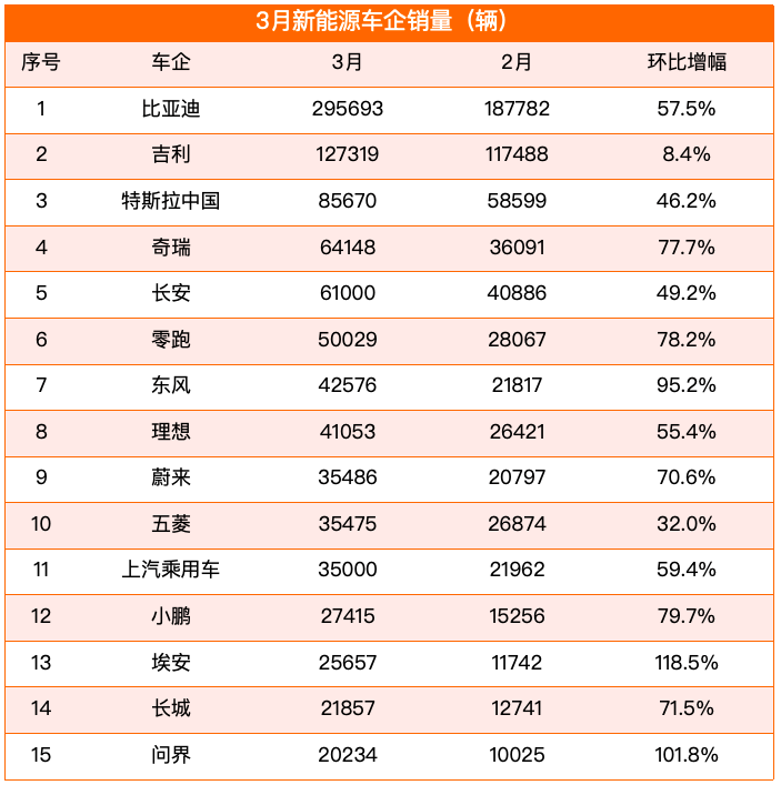 3月,比亚迪以295,693辆的销量继续领跑,环比增长57.5%,但同比下滑超20%。
