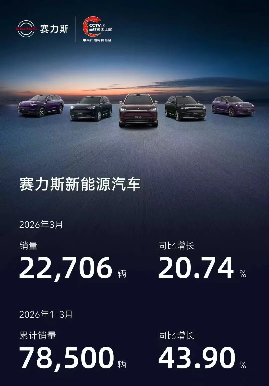赛力斯新能源汽车3月销量22,706辆,同比增长20.74%;今年1-3月累计销量达78,500辆,同比增长43.90%。