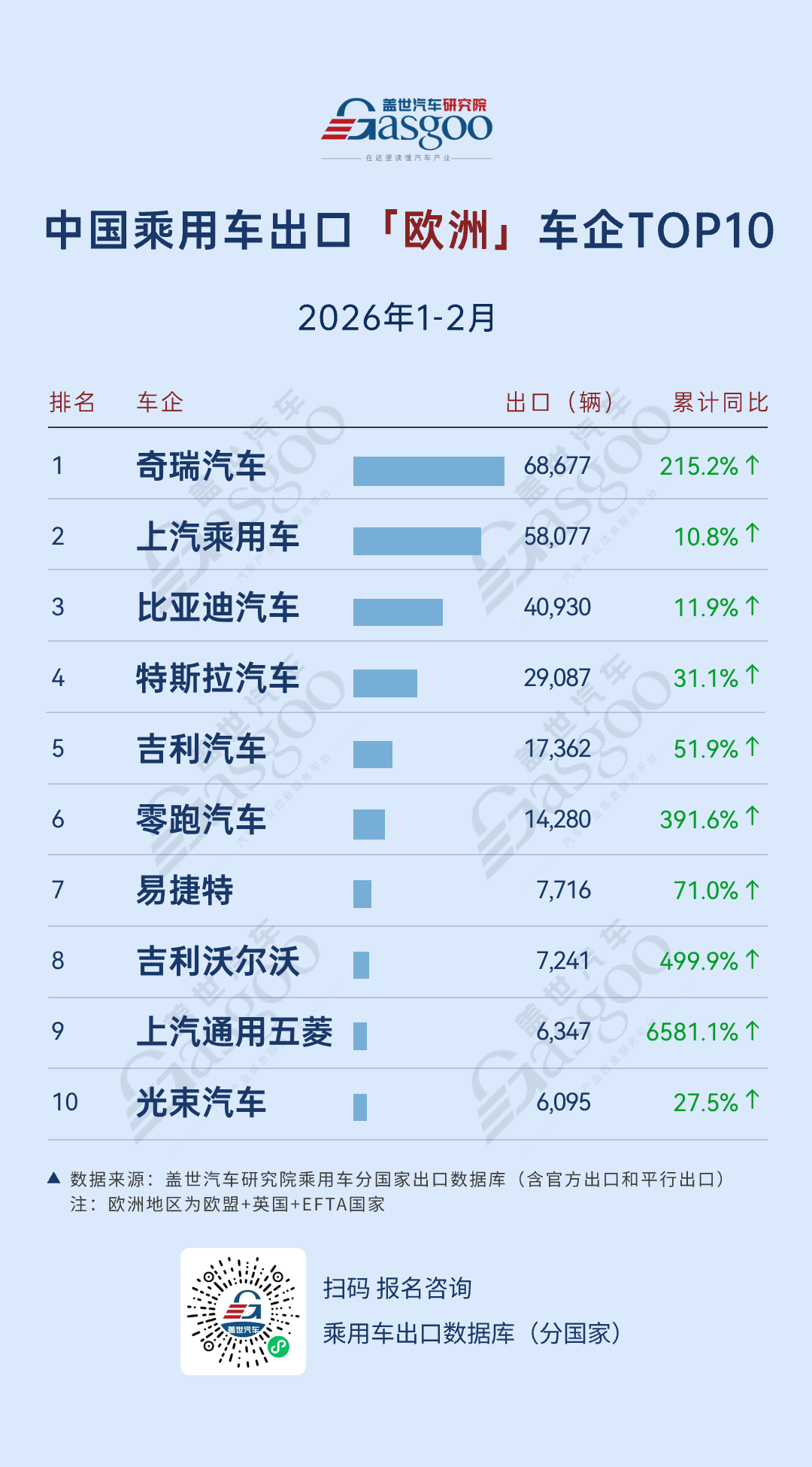 NO.10 光束汽车。2026年1-2月,向欧洲出口6,095辆,累计同比增加27.5%。