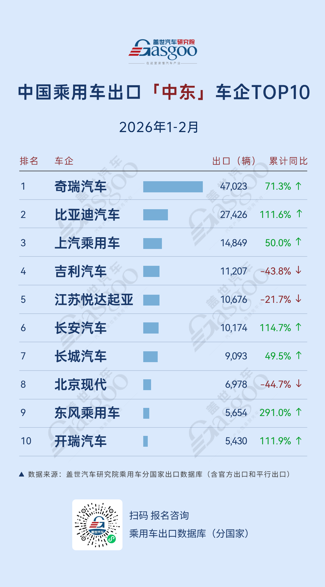 NO.1 奇瑞汽车。2026年1-2月,向中东出口47,023辆,累计同比增加71.3%。