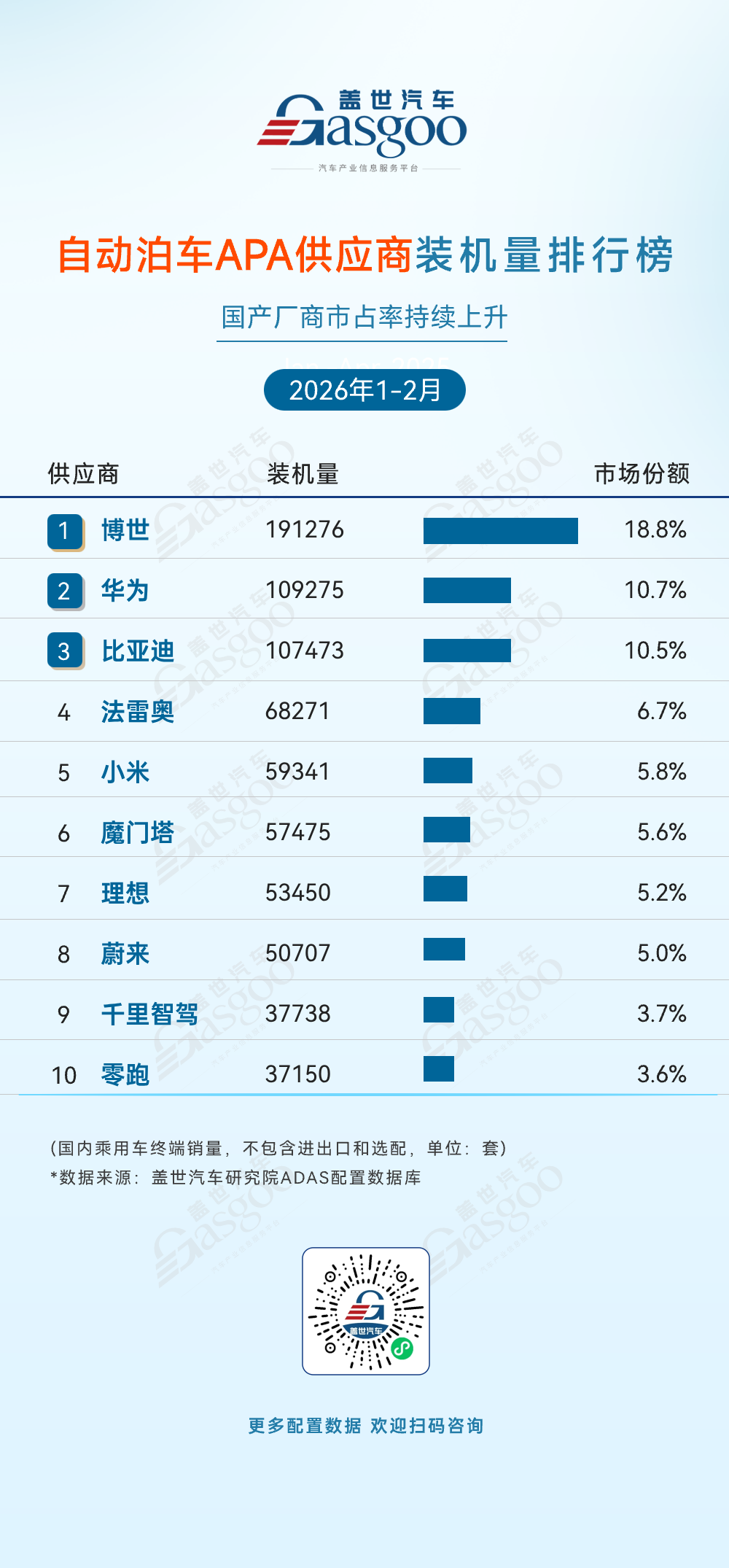 博世。2026年1-2月,国内乘用车市场自动泊车APA装机量191,276套,市场份额18.8%。