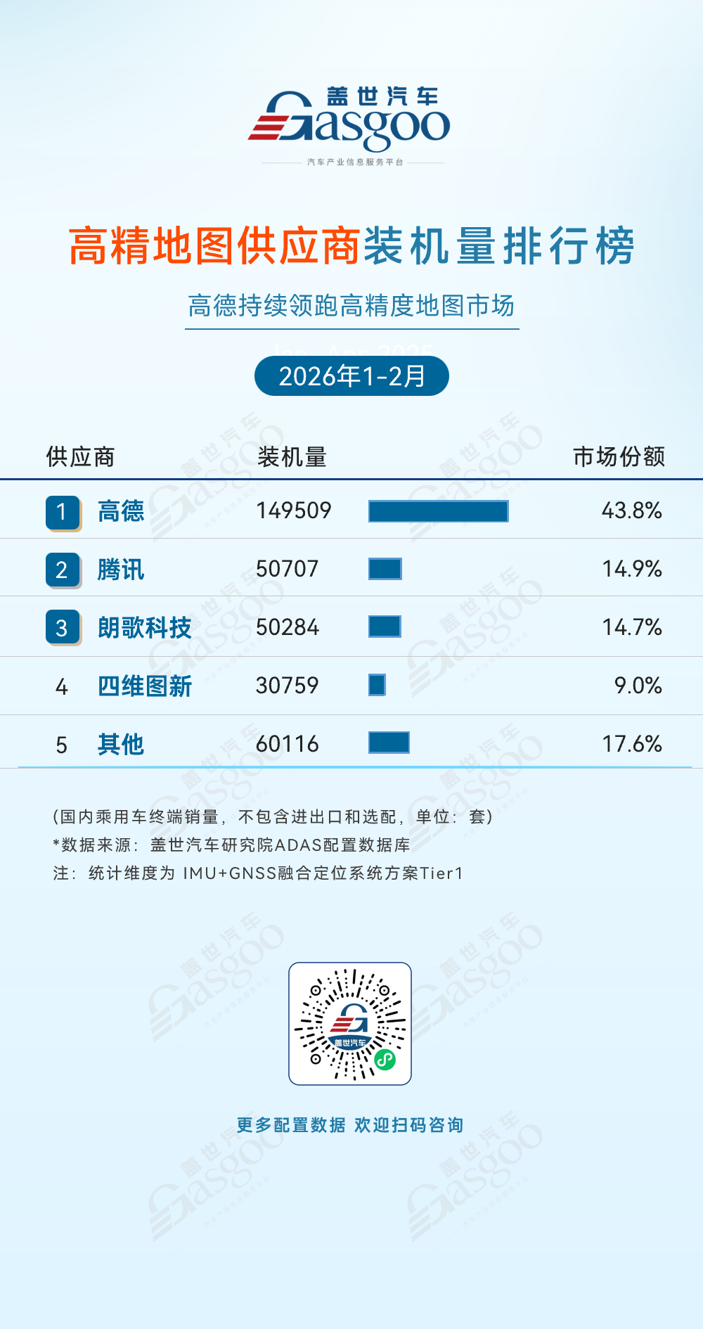 高德。2026年1-2月,国内乘用车市场高精地图装机量149,509套,市场份额43.8%。