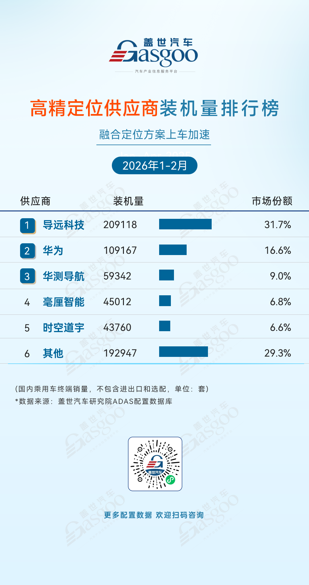 其他。2026年1-2月,国内乘用车市场高精定位装机量192,947套,市场份额29.3%。