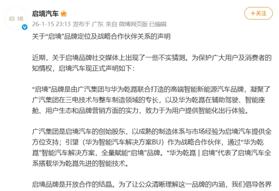 1月15日晚,启境汽车官方微博发布关于“启境”品牌定位及战略合作伙伴关系的声明称,伴随广汽集团与华为乾崑合作...[详细]